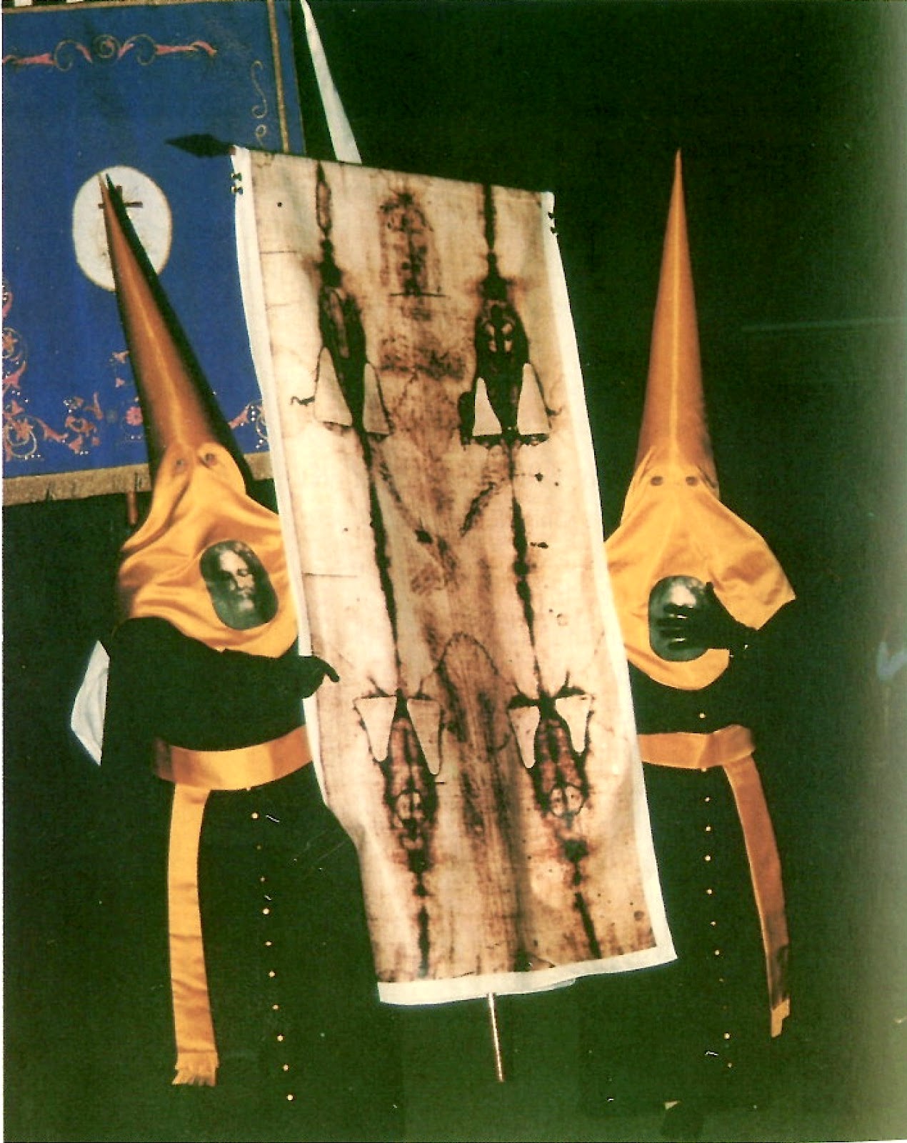 I spoke to my Mallorquin friend and neighbour, Francesca Puig Server, about her membership of the brotherhood, Confraria del Sant Sudari in Soller. She told me that throughout the year its members organise the collection and distribution of food to the poor in Soller. (Indeed, you will often see them collecting food from shoppers at the main supermarket in the town). She is proud to have been a member of this brotherhood for many years. Other family members are also belong to the same group. She has a special devotion to the Sant Sudari or “Holy Shroud.” Its full title in English is “The Holy Shroud of Turin” and it is a length of linen cloth, which is believed to be the cloth that swathed the body of Christ and which bears the image of his body and the wounds of his crucifixion. It is exhibited in the Turin Cathedral. Francesca told me that, by focusing on the Holy Shroud, she is better able to contemplate Christ’s Passion and Resurrection. She explained that the penitential costumes worn by the Confraria del Sant Sudari for the processions comprise a black tunic, cape and gloves to represent his death and the yellow or gold of their headwear, belt and buttons represents the brightness and joy of the resurrection. The brotherhood is easily also identified by the banner they carry, which is a full-scale replica of the Holy Shroud of Turin. (Please see the photograph of members of the Confraria del Sant Sudari taken during a previous year’s procession).