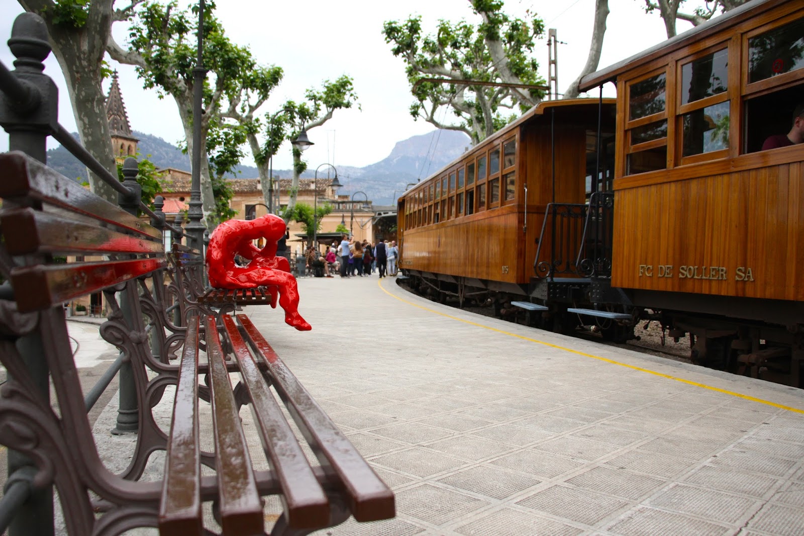 This week in Soller we have been celebrating the Firo. The battle has been won for another year and the Christians were victorious again. Many inaugurations of art exhibitions have taken place this week in honour of the Firo. The new one at the station is particularly interesting. A red person is sitting on the seat on the platform and he or she invites you to sit next to him and put your arm in his. The title of this work is ‘The Dreamer’ and has been created by local artist Francesca Marti. The ancient and the modern sit well in the art world of Soller.