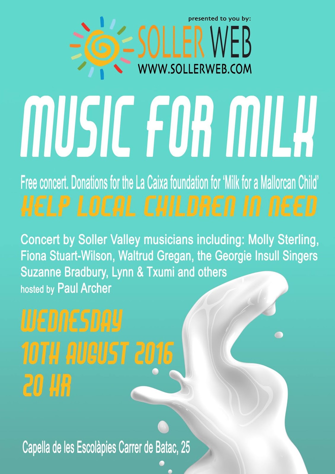 Music for Milk is our contribution and the speed at which we have been able to put a Pop Up Concert together is amazing. With the support of the Town Hall and their provision of a venue in the Escolapies cultural Centre of Soller our very own Milk Aid has rolled into the City. It all takes place on Wednesday 10thAugust 2016 at 8 pm. The musicians offering their support and talent has been amazing and they include some of the busiest talents on this island.