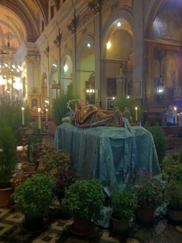 Before the hedonism of the fiesta we are grounded by one of the Churches High Holy days of obligation. The Day of Assumption happened yesterday and created the only National Bank Holiday in August. Catholics everywhere are expected to attend mass on these special days and that was the case here. The church was packed for the service and to touch the feet of the statue. The Assumption is when Mary dies and goes to heaven without her body decaying. The tableau in Sant Bartholomew Church has her watched over by angels and surrounded by plants. I am always surprised by the size of the feet of this image and the way that people touch them as they pass.
